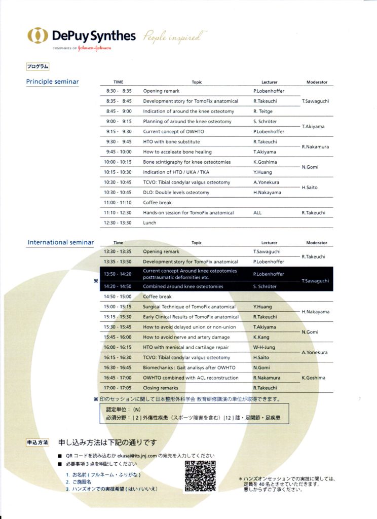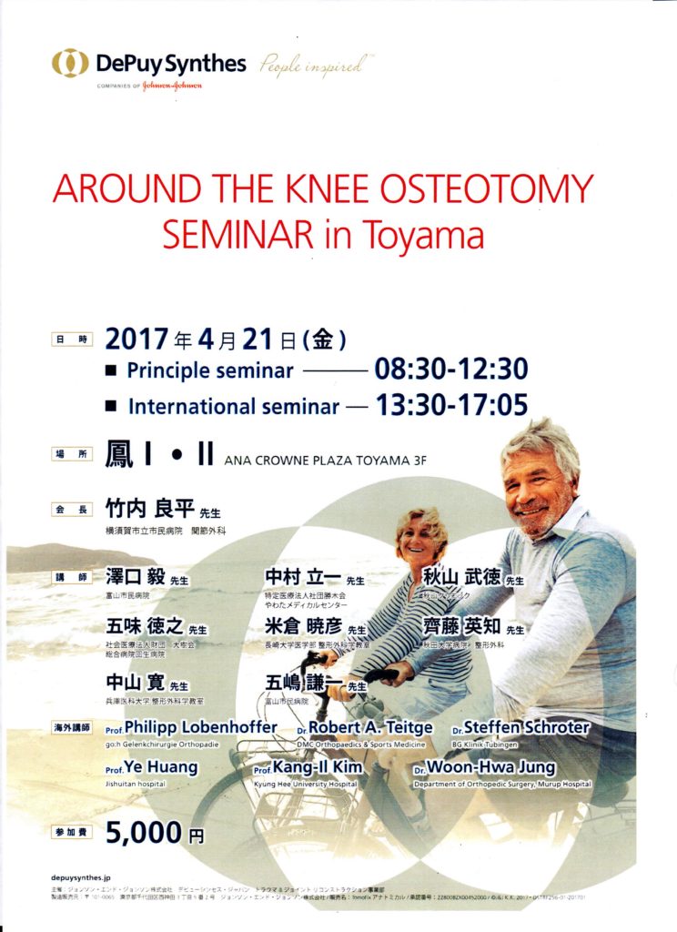 2017年4月21日に富山で開催される「AROUND THE KNEE OSTEOTOMY SEMINAR in Toyama」にて、院長が講演2題を行います。