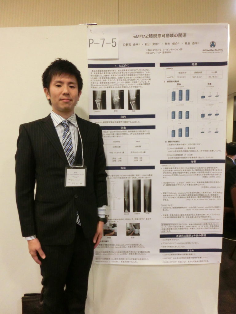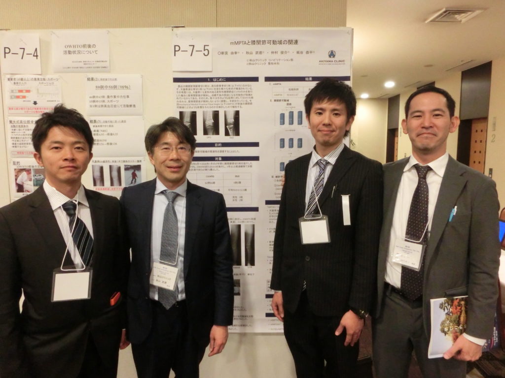 当クリニックの秋山院長が「一般開業医から見たAround the knee osteotomyのタイミングについて」というタイトルで、膝周囲骨切り術を選択するタイミングについて発表しました。理学療法士の新宮が「mMPTAと膝関節可動域の関連」というタイトルで手術後の膝のアライメント(骨配列)と膝関節の動きについて発表しました。また、秋山院長が、他の病院のスタッフが発表する際の座長を務めました。