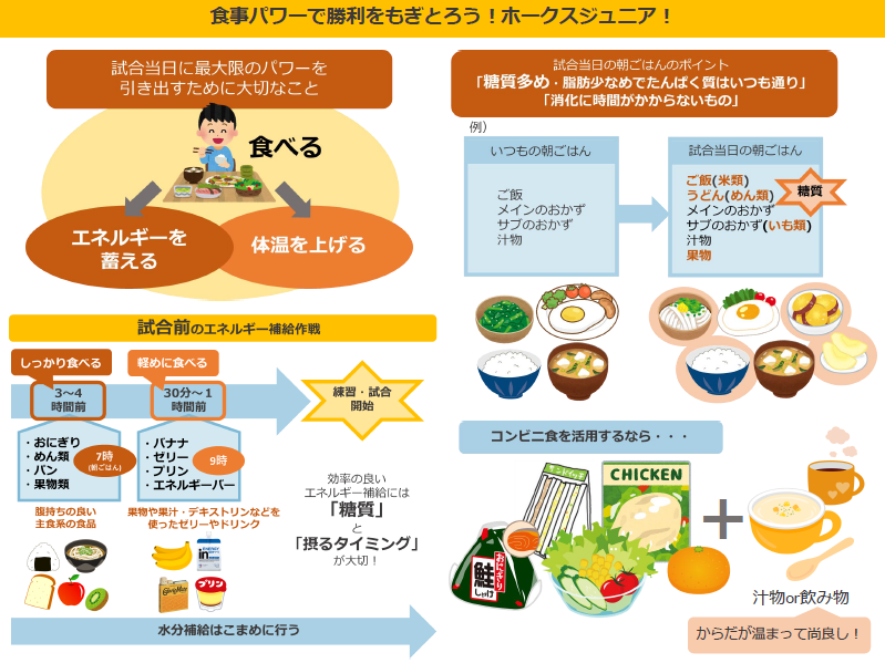 「試合当日の栄養補給方法」について資料を作成し、栄養教育を行わせていただきました。